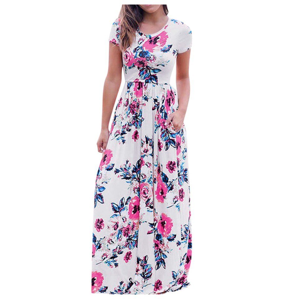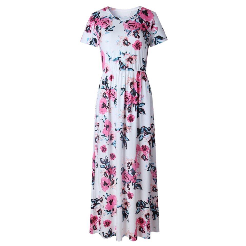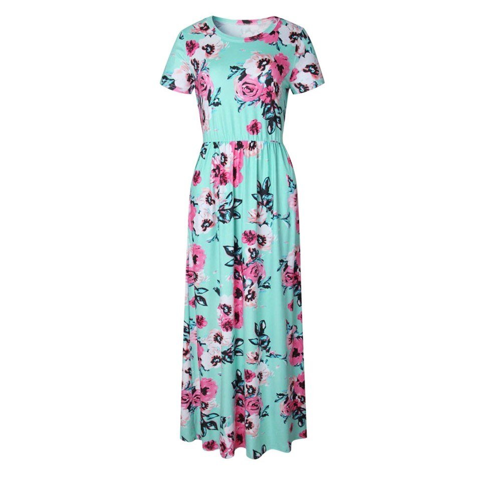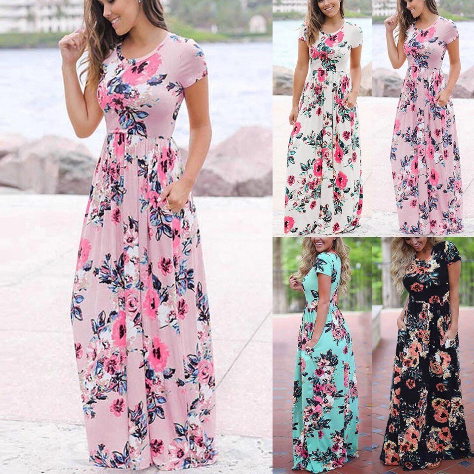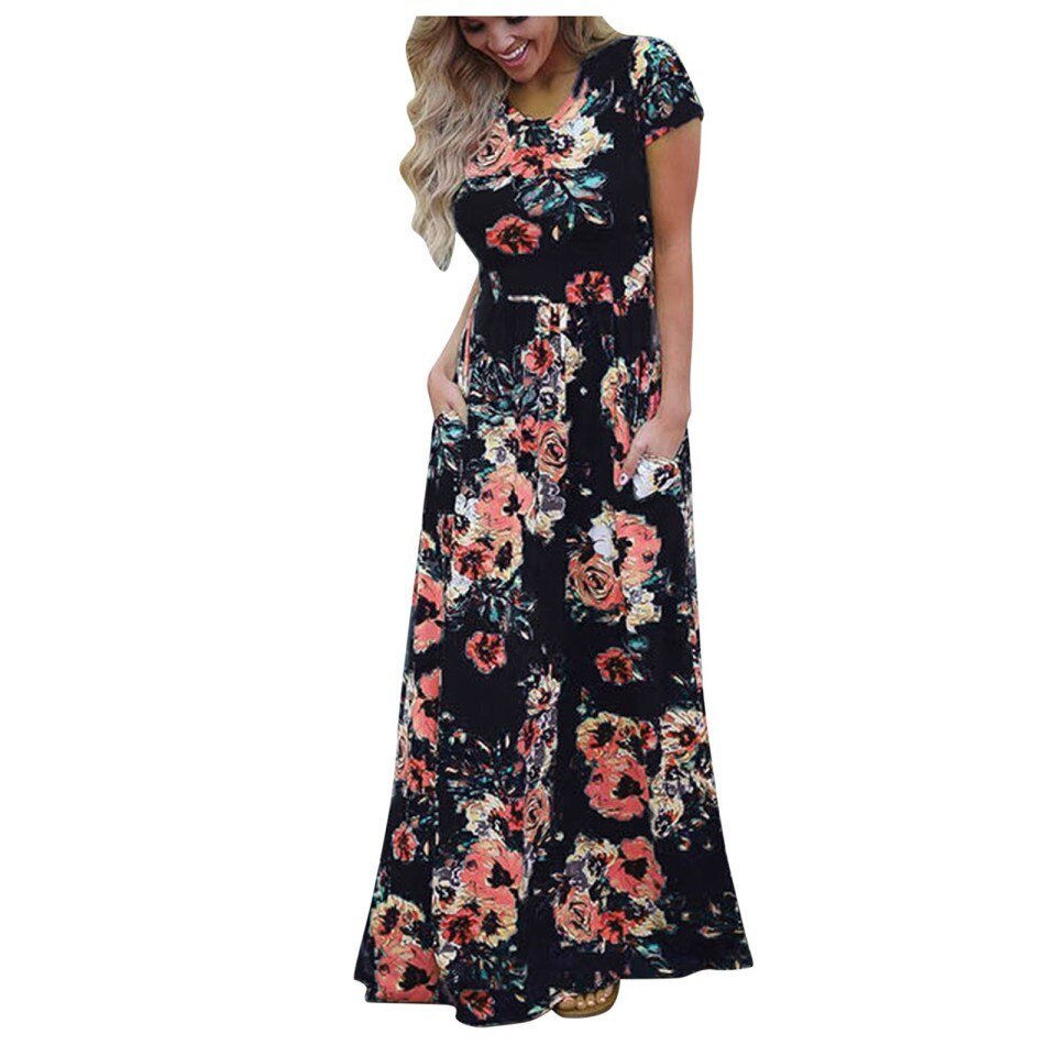 Women’s Casual Floral Printed Dress Short Sleeve Maxi Dress WIth Pockets
