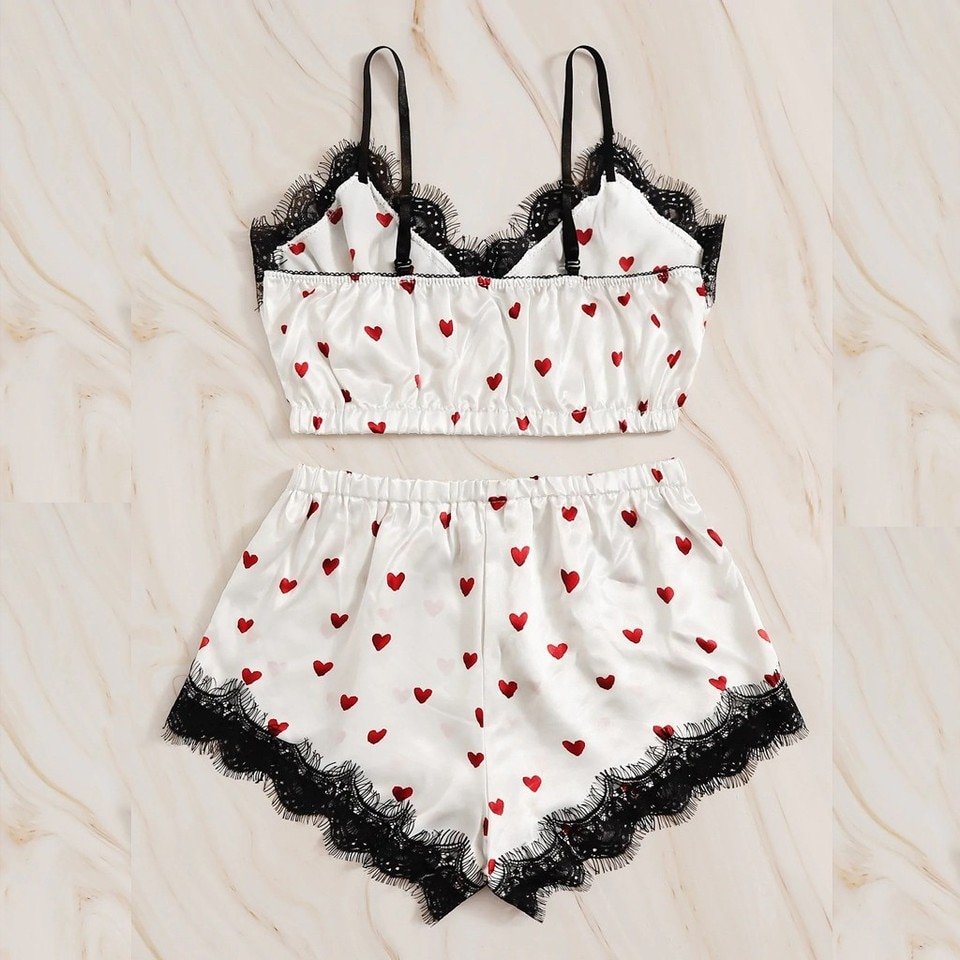Women V-Neck Heart Print Lace Satin Camisole Pajamas Bowknot Shorts Lingerie Set