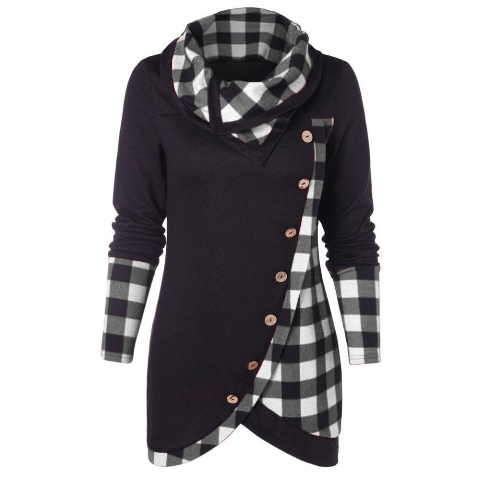 Blouse Women Long Sleeve Irregular Hem Plaid Button Turtleneck Tartan Tunic Sweatshirt Pullover Tops